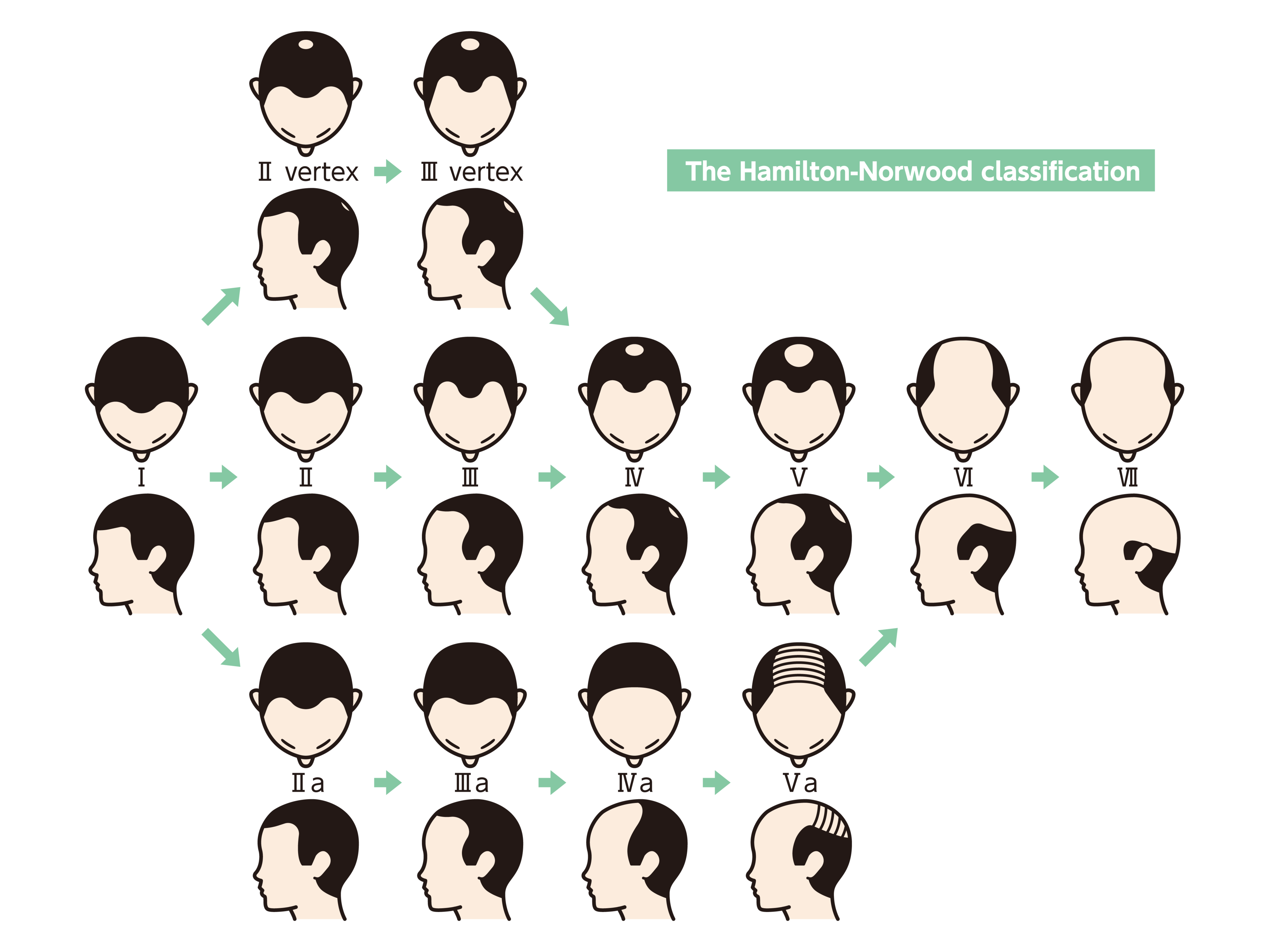 AGAは進行パターンから種類を分類することができます。上記はハミルトン・ノーウッド分類と呼ばれるもので、日本人は『Vertex型』が多いのが特徴です。欧米人に比べ、頭頂部がO型に脱毛していきます。