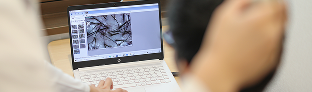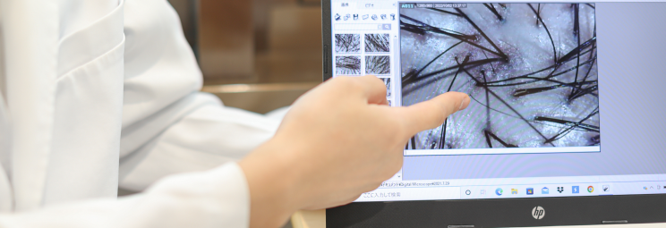 問診票を元に医師が直接、頭髪、頭⽪、医師が専⽤カメラを使った頭⽪チェックを⾏います。このスコープを使い毛髪の様子を見ることでAGAの進行具合などを細かくみていきます。⾝体の健康状態を問診させていただきます。
